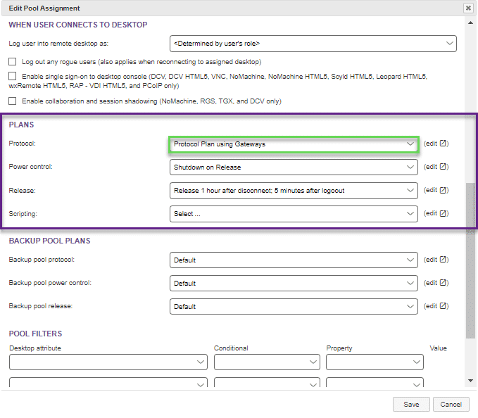working on it locally. The Connection Broker uses 'protocol plans' to determine which protocol is used for the connection and the configuration option settings. By default, the Connection Broker uses the protocol plan defined in the user's Policy - Pool configuration. There may be times when you want to override this protocol definition for reasons such as an application used on the desktop, the location where the user is working from, or a user preference for a different protocol.